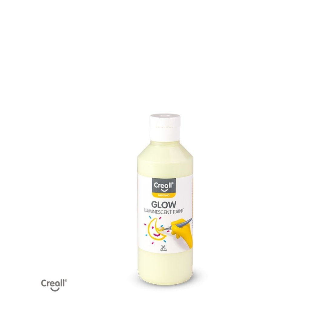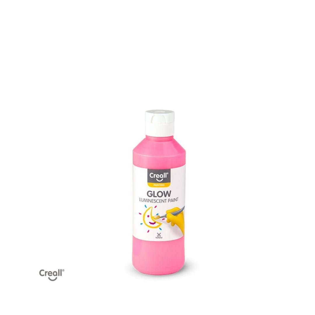 Creall Glow Nachtleuchtfarbe 250 ml – wasserfest, hohe Deckkraft, leuchtet im Dunkeln. Ideal für Kinder und kreative Projekte in Gelb/Grün, Rot/Pink und Blau.