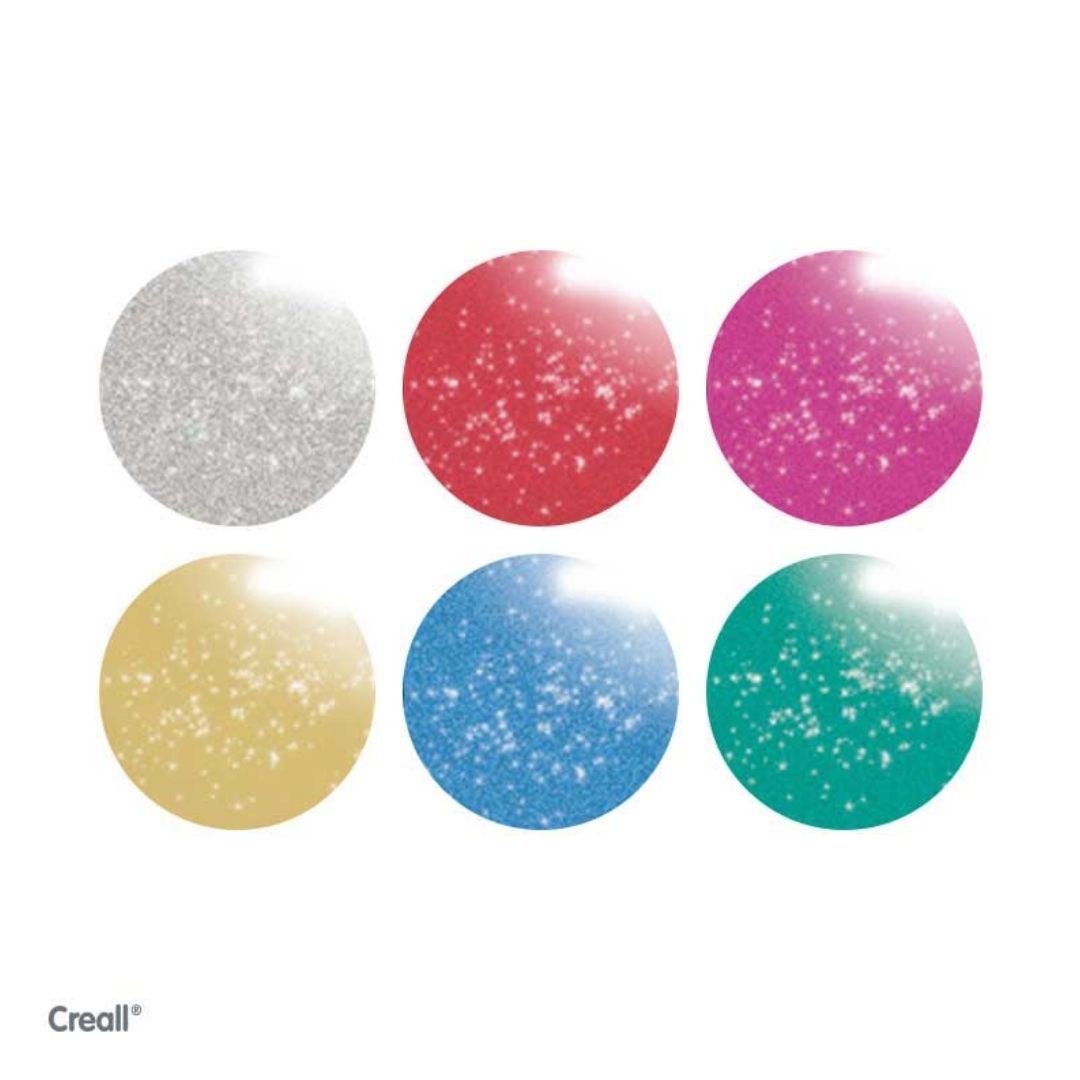 Das Creall Glitter Glue 6-Set enthält farbenfrohen Glitzerleim auf Wasserbasis – schnelltrocknend, lösungsmittelfrei und ideal zum Basteln und Dekorieren.