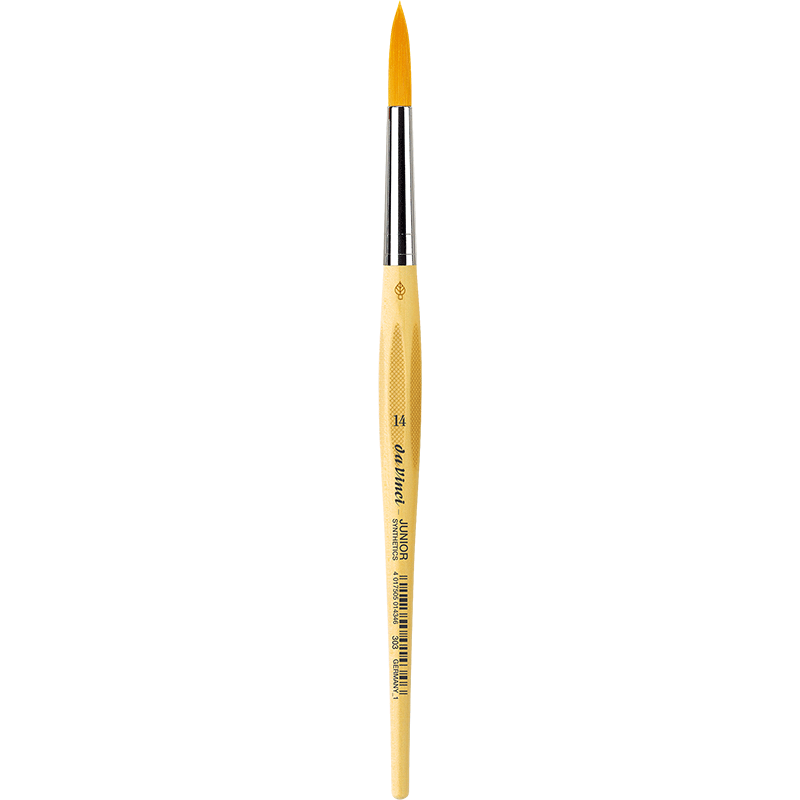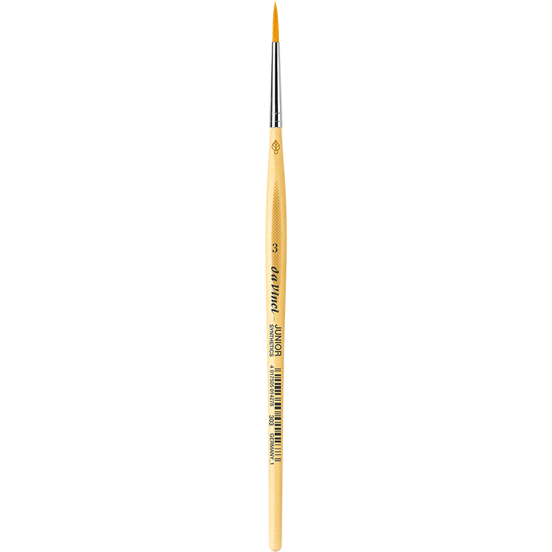 Der da Vinci JUNIOR Synthetics Rundpinsel Serie 303 ist speziell für junge Künstlerinnen und Künstler entwickelt, die Wert auf Qualität und Kontrolle beim Malen legen. Seine elastischen, goldfarbenen Synthetikfasern bieten eine sehr gute Formbeständigkeit und machen den Pinsel ideal für feine Linien, Konturen und Details.