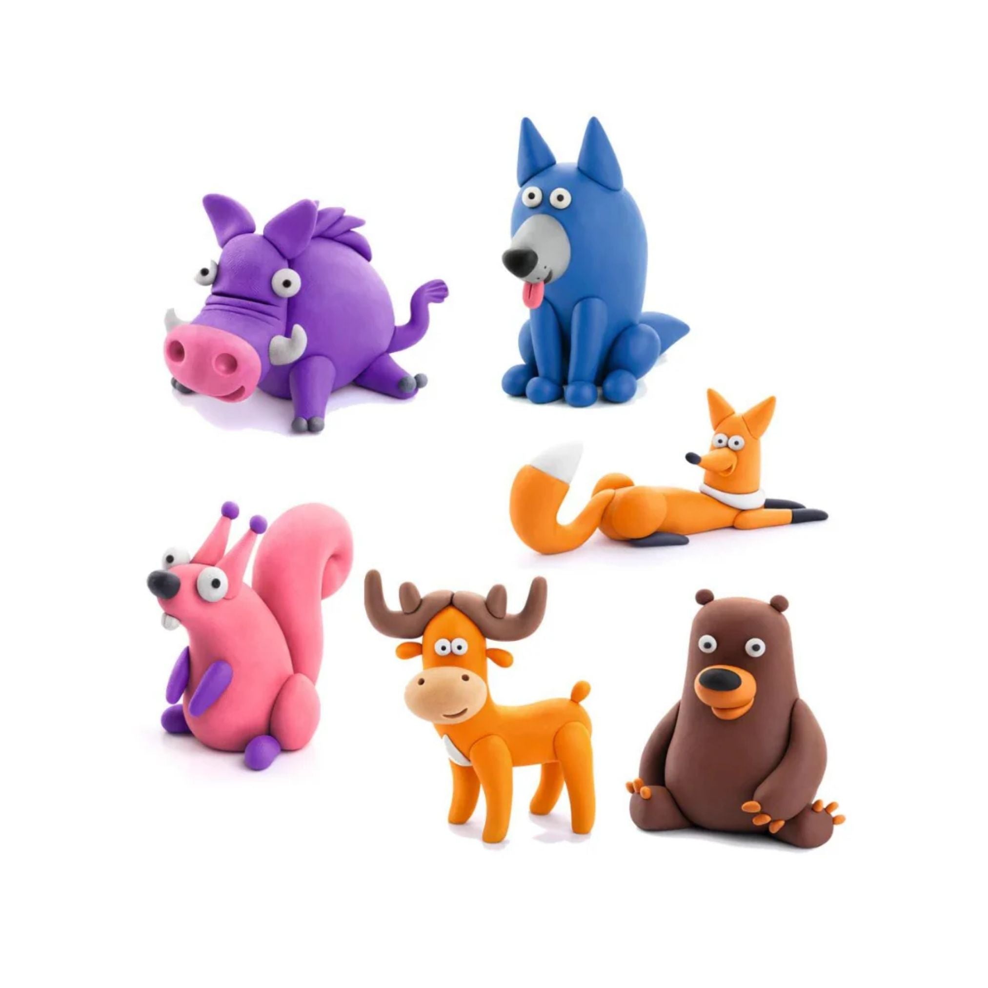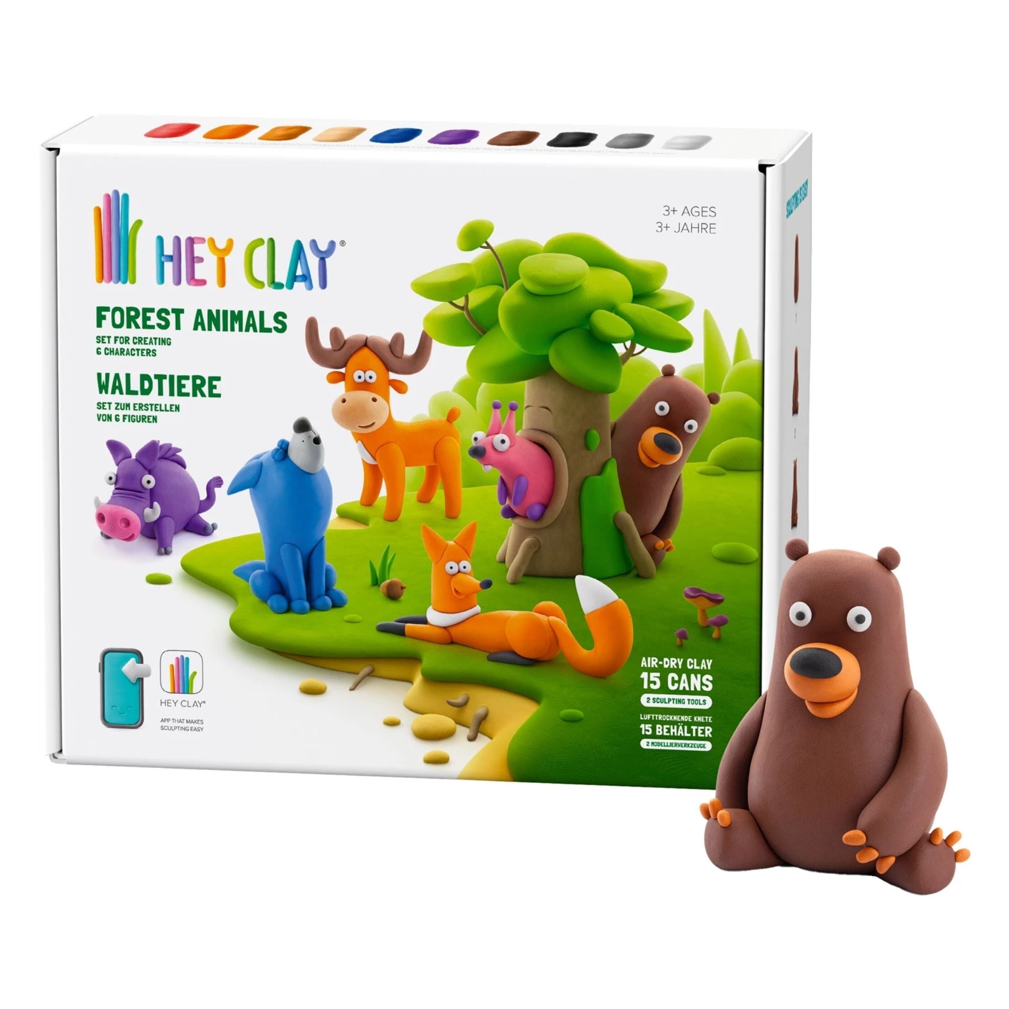Hey Clay Waldtiere Air-Dry Knetset mit 15 bunten Dosen. Weich, ungiftig, nicht klebend. Mit App-Anleitung für 6 Waldtiere, ab 3 Jahren geeignet.