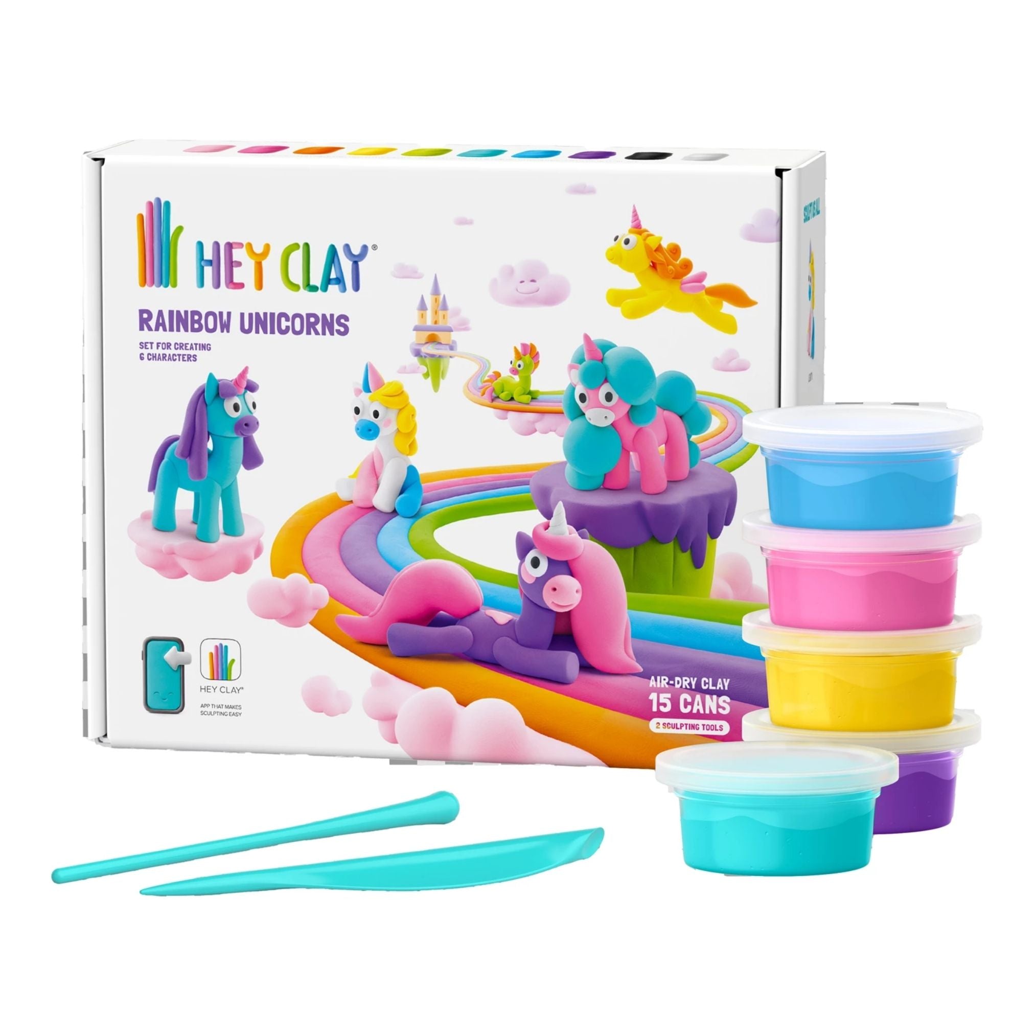 Hey Clay Regenbogen Einhörner Air-Dry Knetset mit 15 bunten Dosen. Weich, ungiftig, nicht klebend – mit App-Anleitung für 6 Regenbogen Einhörner, ab 3 Jahren geeignet.