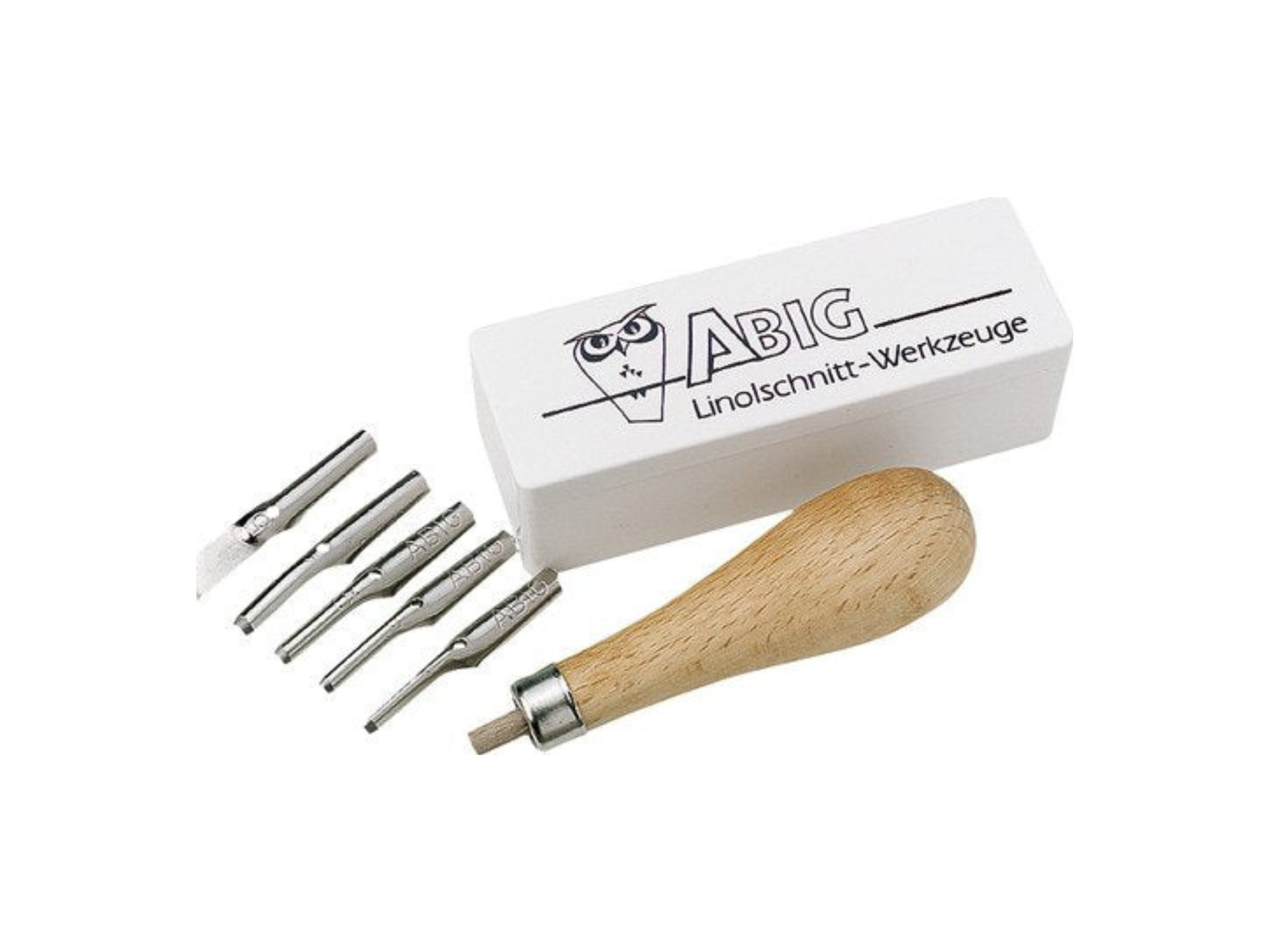 ABIG Linolschnitt-Garnitur mit Holzgriff, Ausstosser und 5 handgeschärften Schneidefedern – ideal für präzises Schneiden im Kunst- und Schulbereich.