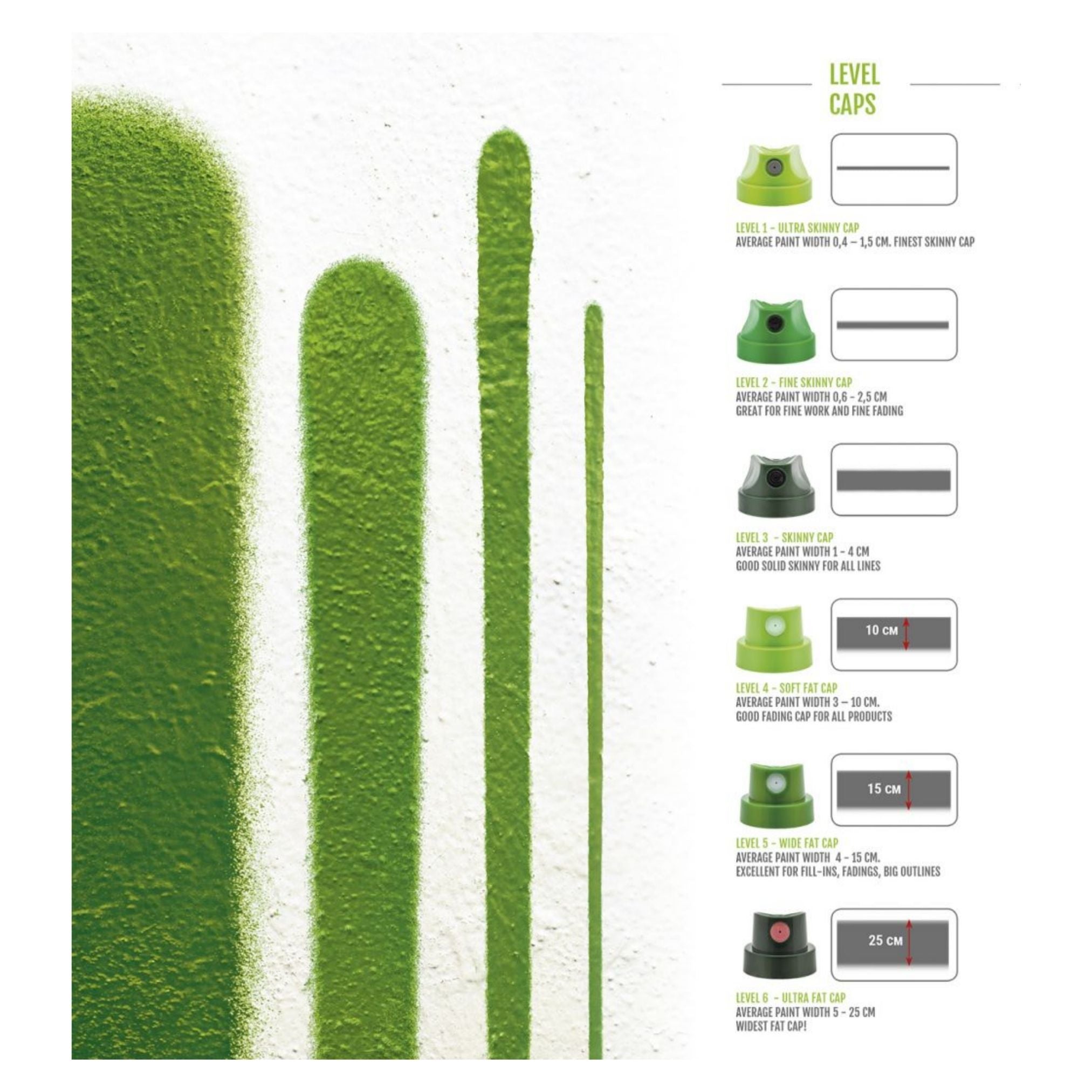 Das Montana TryOut Capset besteht aus den Sprühköpfen Level 1 bis Level 6: