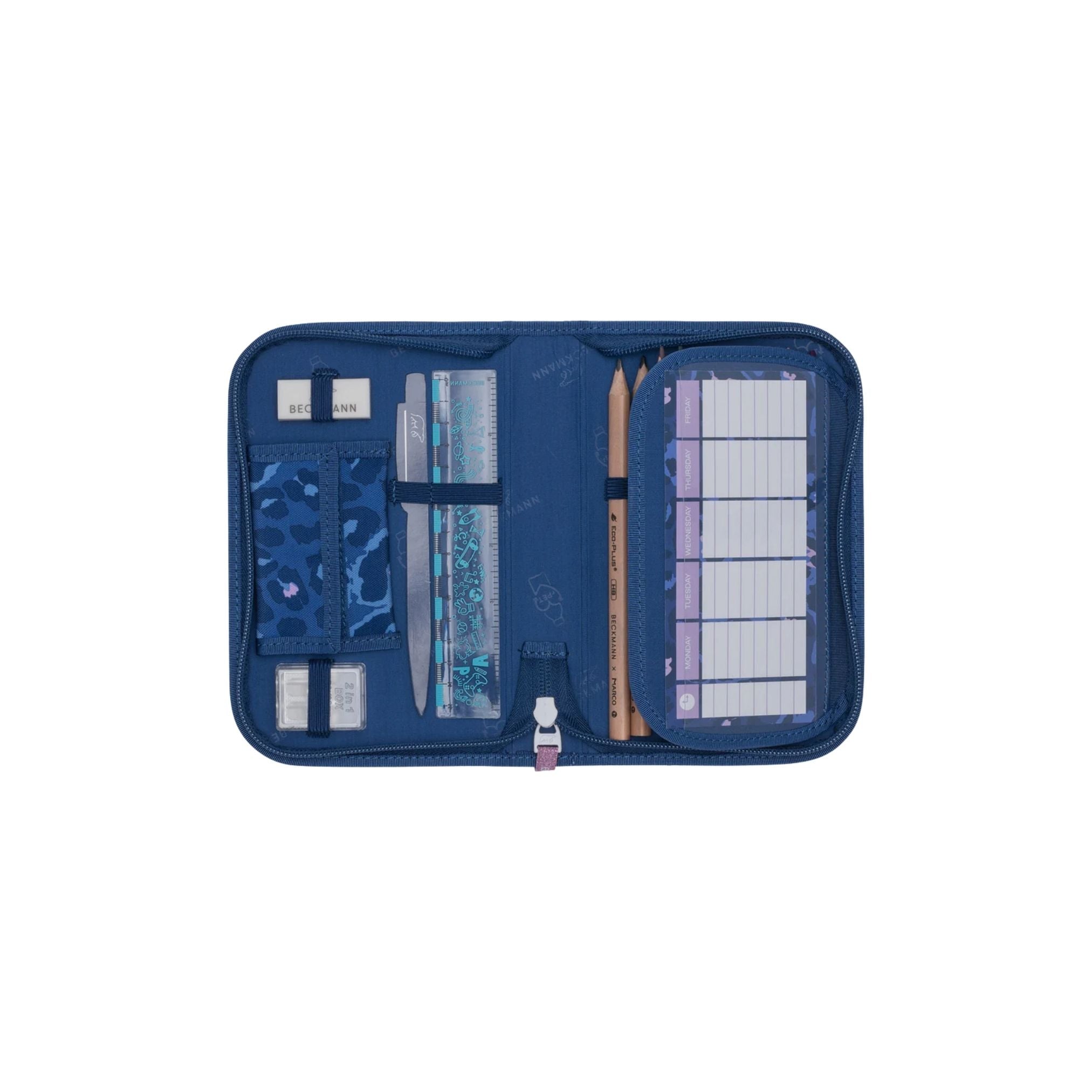 Set bestehend aus: Schulrucksack, Fronttasche zum Wenden für diejenigen, die kein Muster auf der Tasche möchten, Schüleretui B 133 x H 195 x T 38 mm, 2 Klappen, 20-teilig gefüllt mit Marco by BECKMANN Produkten, 7 Farbstifte Jumbo, 7 Farbstifte, 2 Bleistifte Jumbo HB, Massstab 17 cm, Radierer, Doppelspitzer und Brieftasche, Schlamperetui unbestückt B 220 x H 100 x T 50 mm, Sportrucksack Volumen 12 l, B 230 x H 360 x T 150 mm, 4 oder 5 Kletties zum Auswechseln in praktischem Button Bag und Regenhülle.