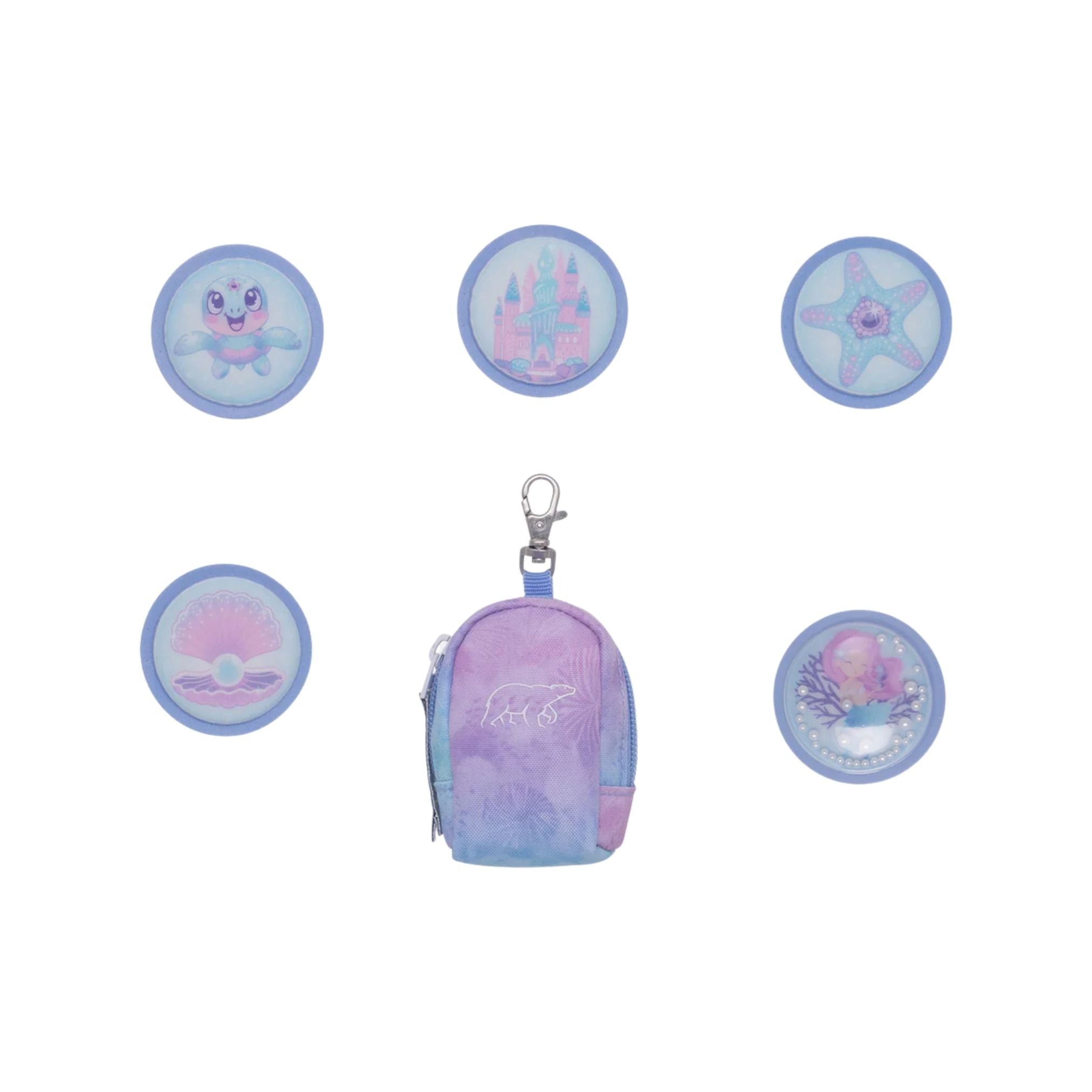 Set bestehend aus: Schulrucksack, Fronttasche zum Wenden für diejenigen, die kein Muster auf der Tasche möchten, Schüleretui B 133 x H 195 x T 38 mm, 2 Klappen, 20-teilig gefüllt mit Marco by BECKMANN Produkten, 7 Farbstifte Jumbo, 7 Farbstifte, 2 Bleistifte Jumbo HB, Massstab 17 cm, Radierer, Doppelspitzer und Brieftasche, Schlamperetui unbestückt B 220 x H 100 x T 50 mm, Sportrucksack Volumen 12 l, B 230 x H 360 x T 150 mm, 4 oder 5 Kletties zum Auswechseln in praktischem Button Bag und Regenhülle.