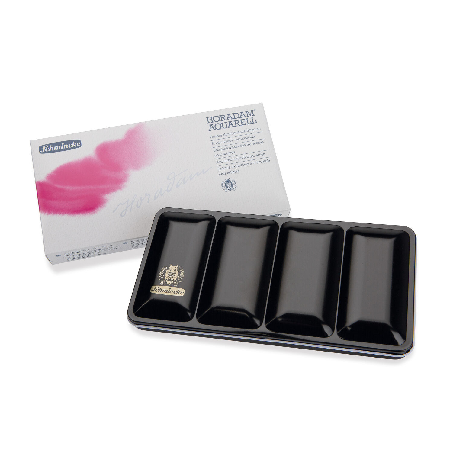 Der HORADAM AQUARELL-Kasten von Schmincke besteht aus einem stabilen Metallkasten (L x B x H: 23,2 x 11,7 x 3,1 cm) mit 18 coloristisch ausgewählten Farben in 5 ml-Tuben sowie einer integrierten Mischpalette. Der Kasten bietet mit der ausgewogenen Farbauswahl ein solides Sortiment, mit dem sich zusätzlich viele weitere brillante Farben leicht mischen lassen. Für Liebhaber von Tubenaquarellfarbe ideal geeignet.