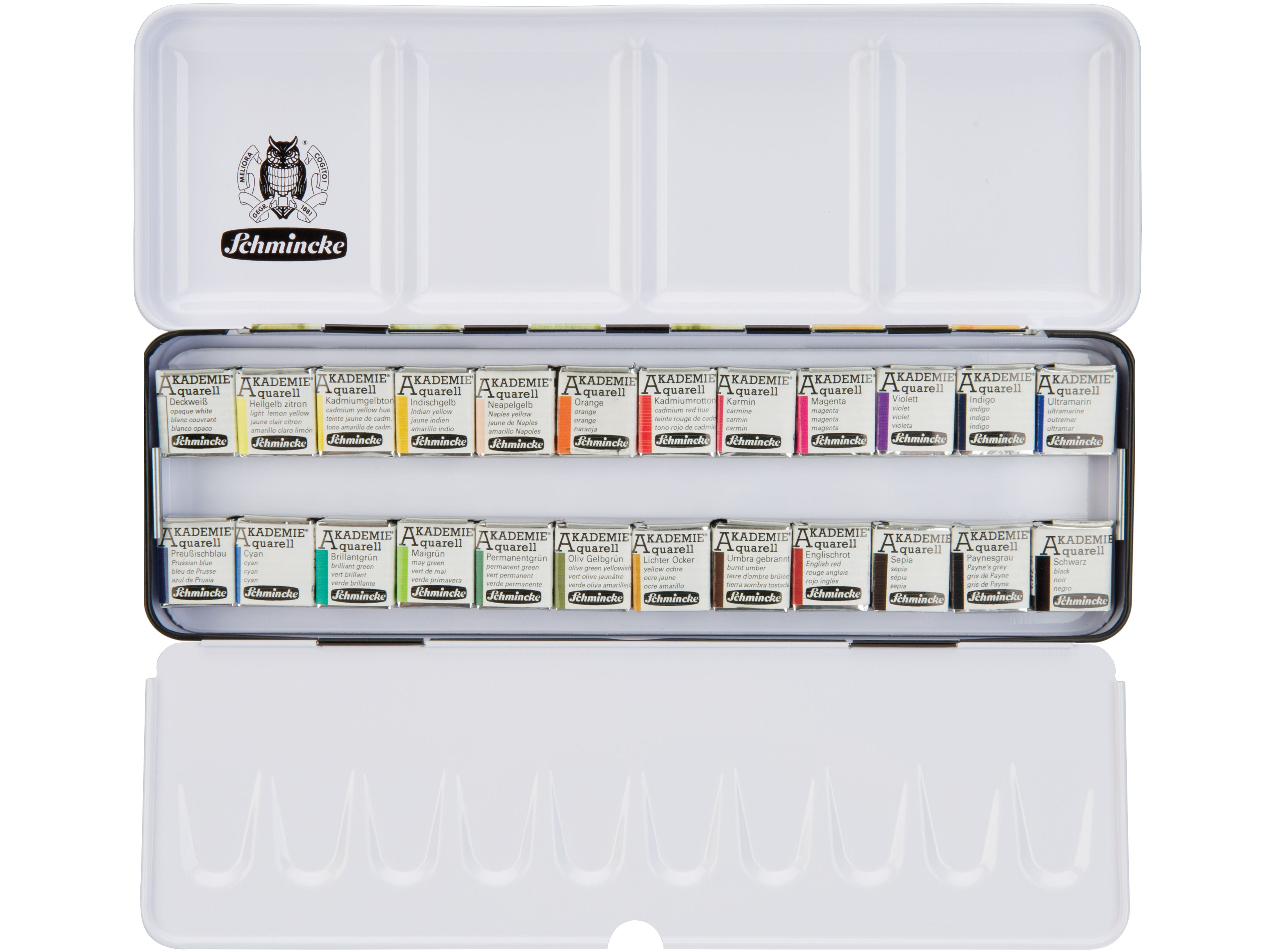 Der HORADAM Einstiegskasten von Schmincke, besteht aus einem stabilen Metallkasten (L x B x H: 22,3 x 7,2 x 2,3 cm) mit 12 coloristisch ausgewählten Farben und Platz für 12 weitere Farben, sowie einer integrierten Mischpalette. Die Farben im Kasten befinden sich in halben Näpfchen Grösse: 1,5 x 2 cm. Mit der ausgewogenen Farbauswahl lassen sich viele weitere brillante Farben leicht mischen.