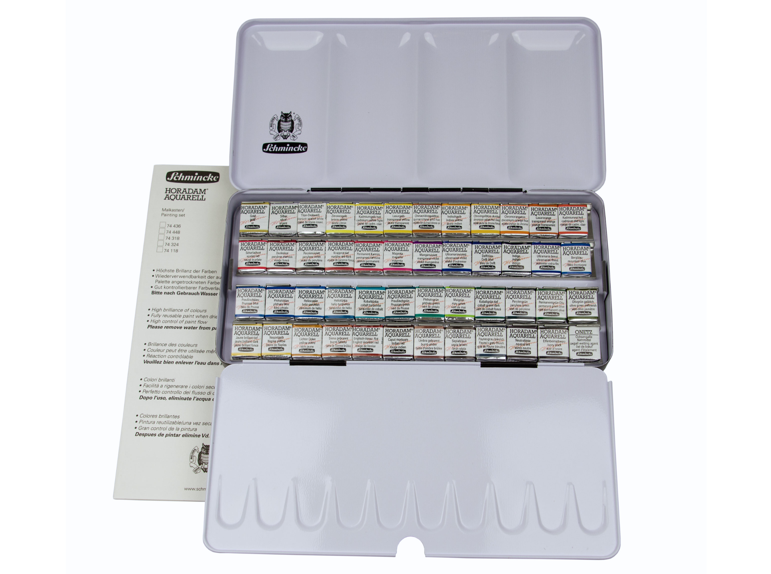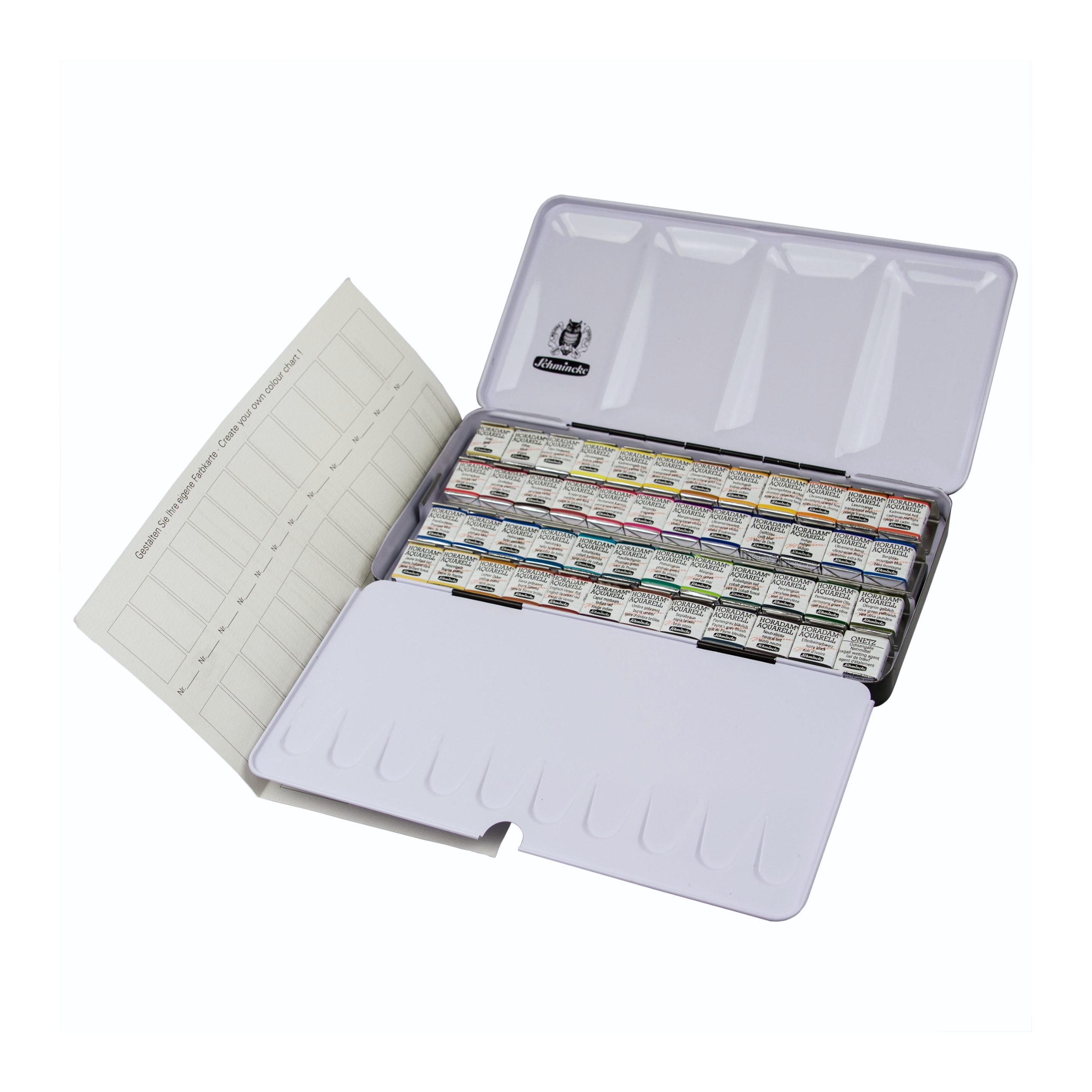 Der HORADAM Einstiegskasten von Schmincke, besteht aus einem stabilen Metallkasten (L x B x H: 23,1 x 11,6 x 3 cm) mit 12 coloristisch ausgewählten Farben und Platz für 12 weitere Farben, sowie einer integrierten Mischpalette. Die Farben im Kasten befinden sich in halben Näpfchen Grösse: 1,5 x 2 cm. Mit der ausgewogenen Farbauswahl lassen sich viele weitere brillante Farben leicht mischen.