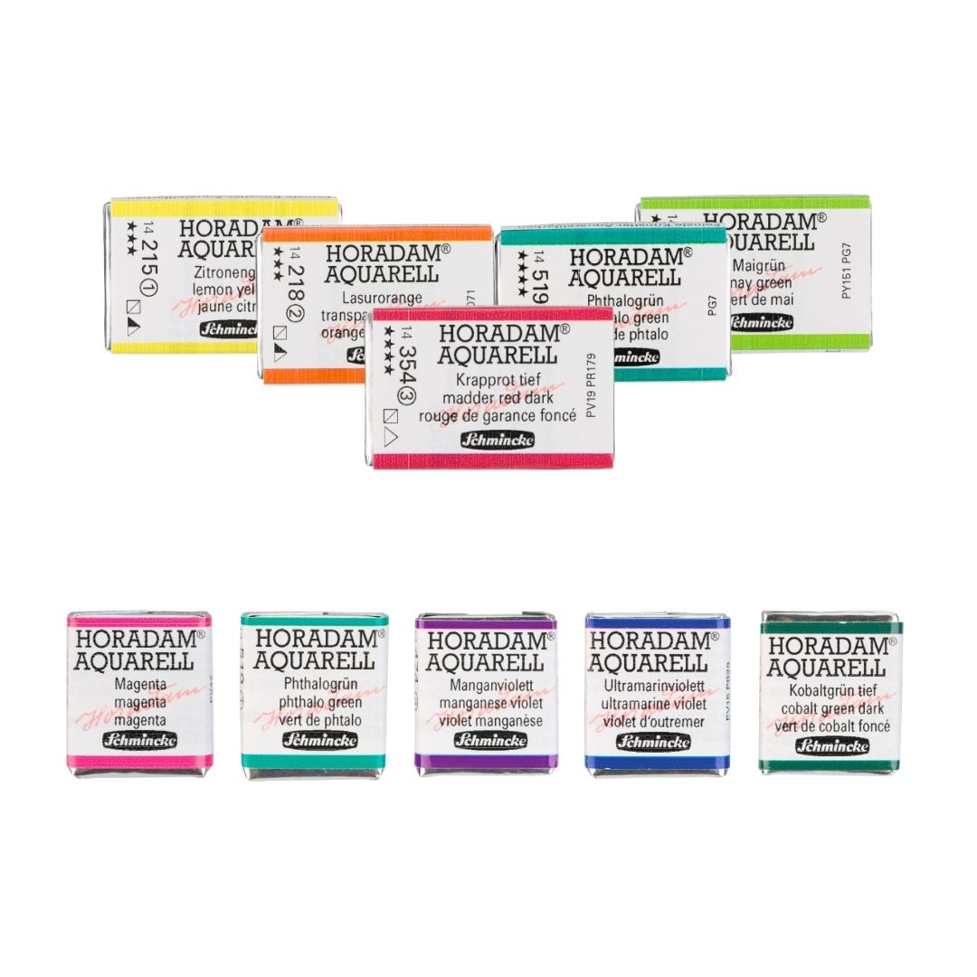 Unser ausgewähltes Sortiment an Horadam Aquarellfarben bietet ein breites Farbspektrum und erfüllt höchste Qualitätsstandards für Premium-Aquarellfarben. Neben bewährten traditionellen Tönen umfasst die Kollektion auch innovative Farben auf besonderen Pigmenten wie Perylene, Chinacridonen und transparenten Eisenoxiden. Viele Ein-Pigment-Farbtöne ermöglichen brillante Mischungen, während granulierte Farbtöne faszinierende Strukturen und Effekte erzeugen.