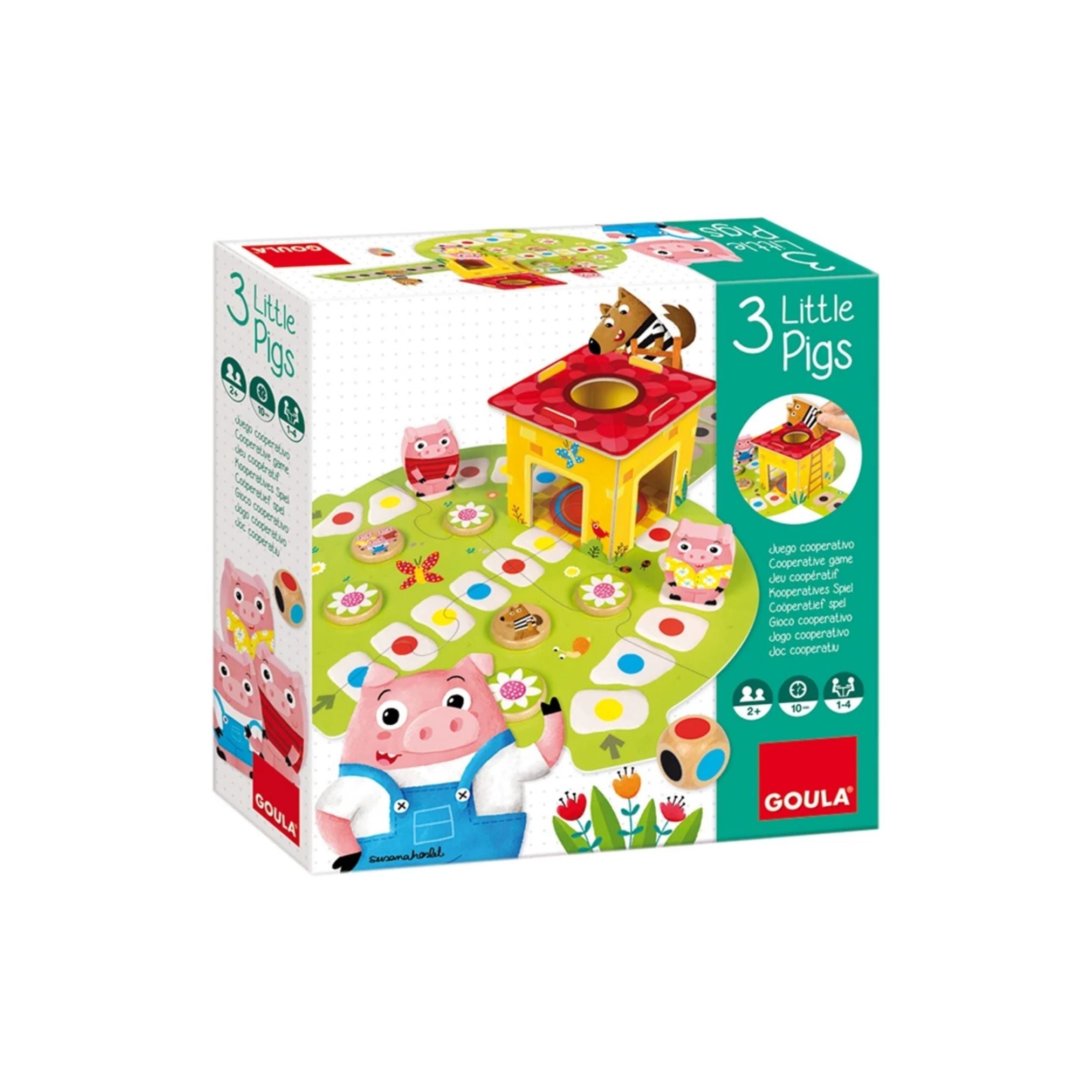 Das erste Spiel zum Zusammenspielen für die Allerkleinsten. Die drei kleinen Schweinchen müssen vor dem Wolf zu Hause sein. Einfache Regeln, elf grosse Holzteile, ein Puzzlebrett und ein dreidimensionales Haus zum zusammenstecken.