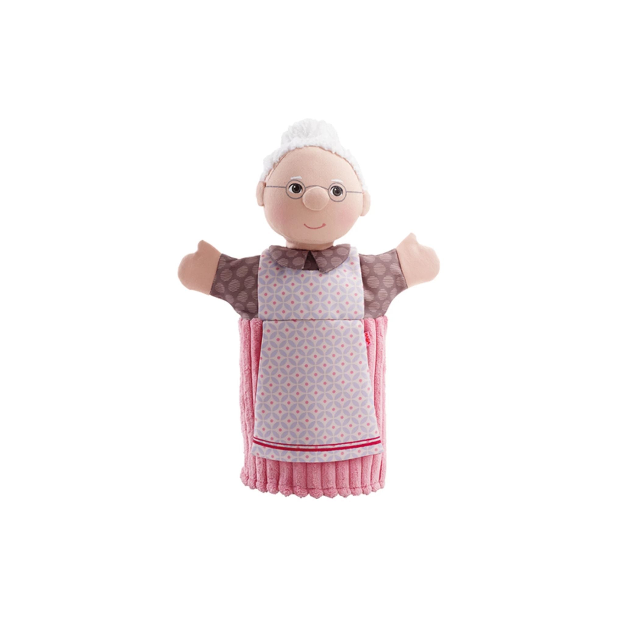 Handpuppe Oma aus weichem Plüsch. Ideal für fantasievolle Rollenspiele, liebevolle Geschichten und Förderung sprachlicher Fähigkeiten.