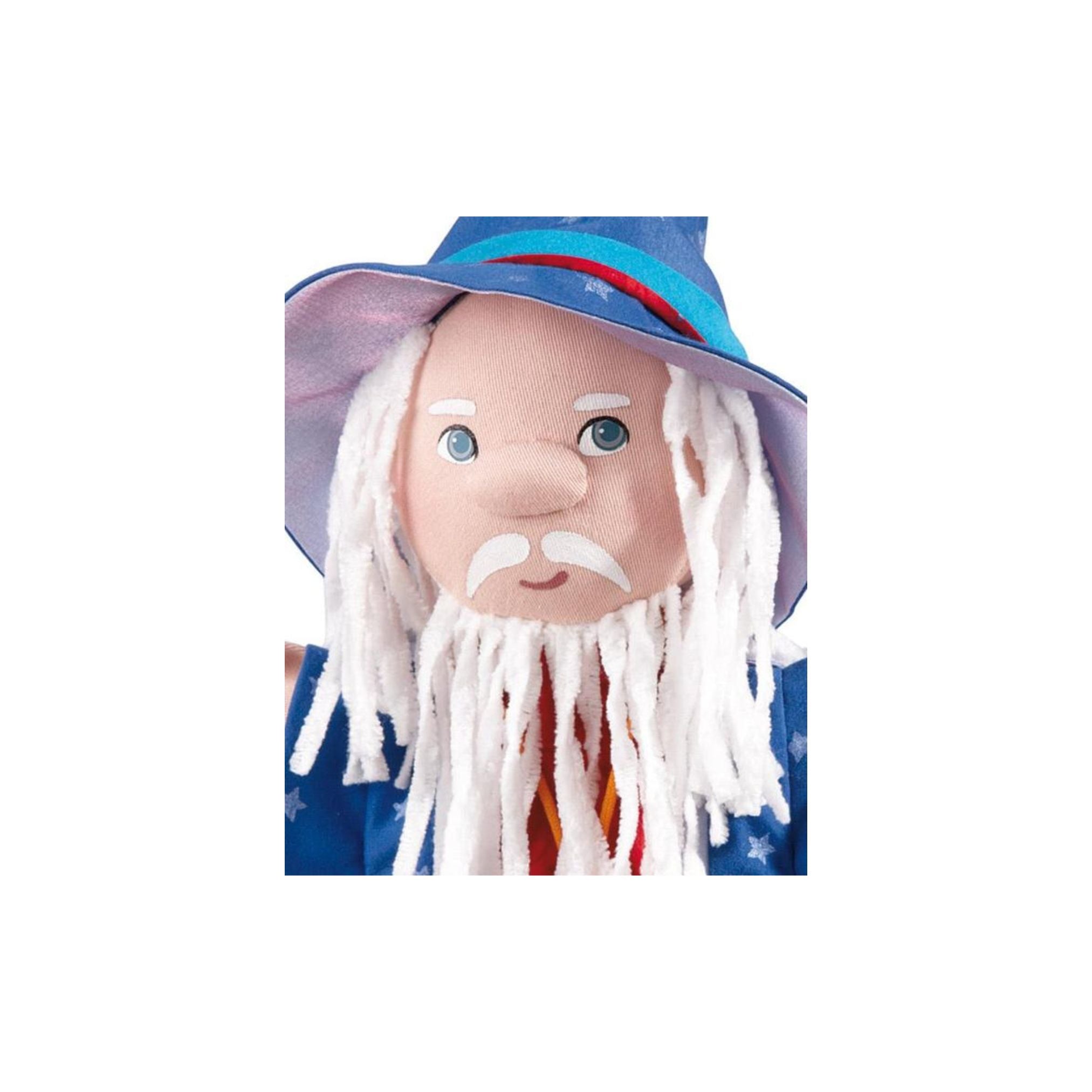 Handpuppe Zauberer aus weichem Plüsch. Ideal für fantasievolle Rollenspiele, magische Geschichten und Förderung der sprachlichen Entwicklung.